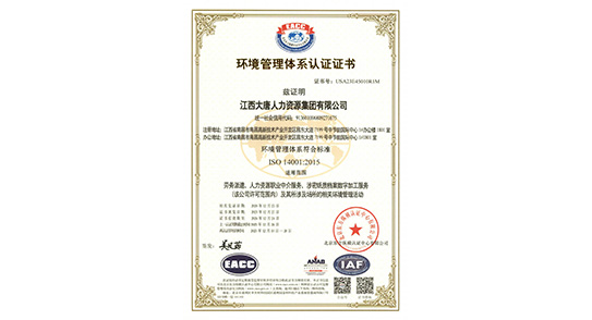 環(huán)境管理體系認證證書