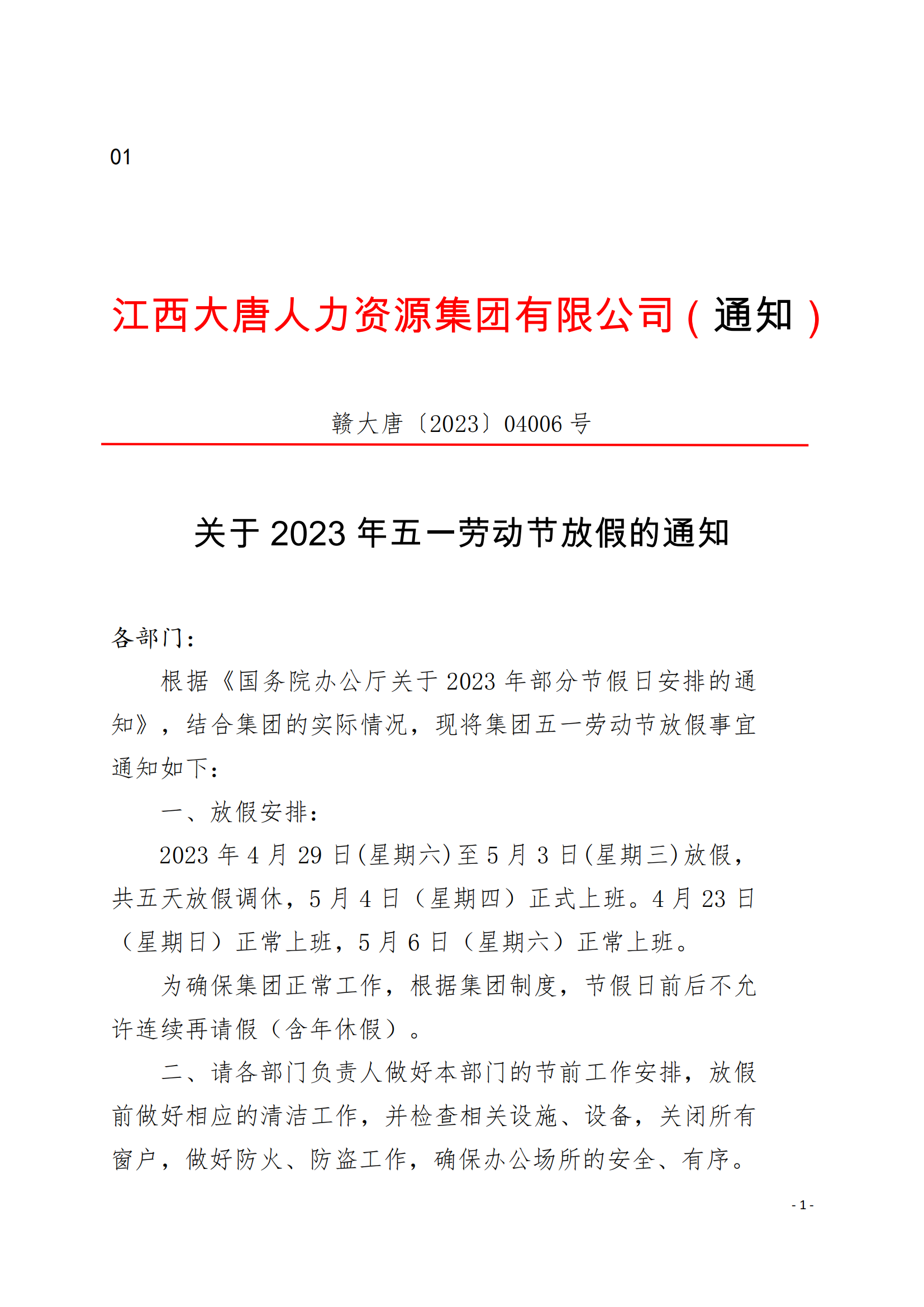 集團(tuán)關(guān)于2023年五一勞動(dòng)節(jié)放假的通知