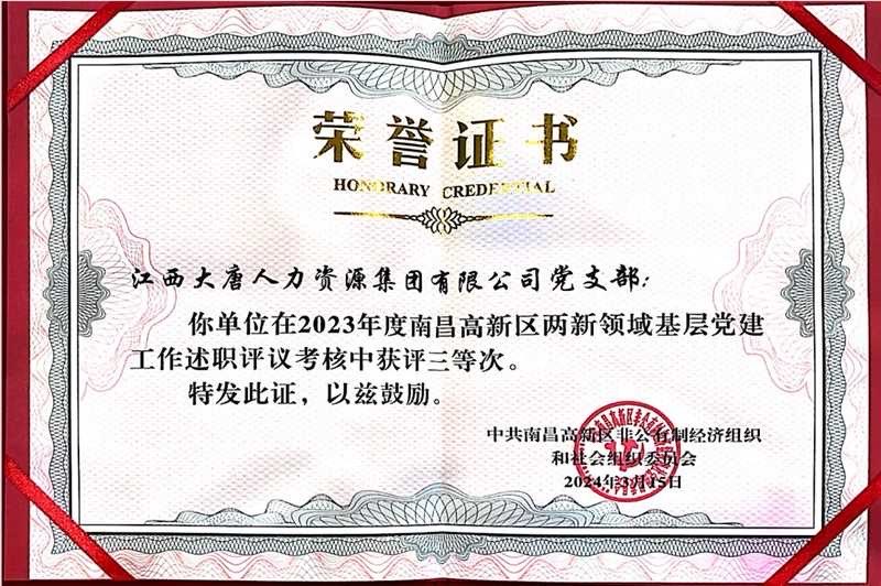 近日,中共南昌高新區(qū)非公有制經(jīng)濟(jì)組織和社會(huì)組織委員會(huì)印發(fā)的《2023年度南昌高新區(qū)非公有制經(jīng)濟(jì)組織和社會(huì)組織黨建工作考核結(jié)果的通報(bào)》,銀控集團(tuán)旗下子公司—江西大唐人力資源集團(tuán)有限公司黨支部獲評(píng)三等次榮譽(yù)。